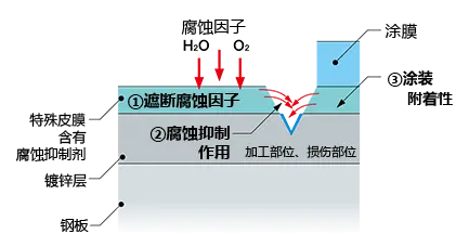 - 具有一层无机系的特殊薄膜,既能满足耐腐蚀性,又具有薄膜的高度“导电性”。