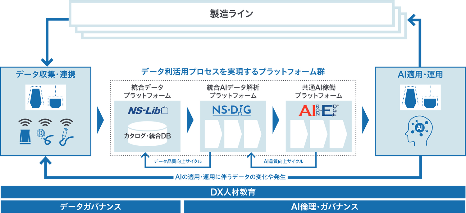 今後は、デジタル改革の要であるデータを基軸とした、「つなげる力」 「あやつる力」を全社員が最大限発揮できるように、データを集めマネジメントする統合データプラットフォームを実現します。社員全員が、適時的確に必要な情報へアクセスできる環境を構築していきます。また、統合データ解析環境であるNS-DIG®による知的生産のサポートを推進します。AI開発プラットフォームであるKAMONOHASHI®を導入したことにより、システムの専門家でないシチズンデータサイエンティストでも、AIモデルを開発できるようになります。更には、エッジコンピューティング基盤であるAIRON-EDGE®を展開することで、コンテナ技術を用いてAIモデルを簡単に現場に適用できるようになる等、デジタル改革を早期に実現できるようになりました。このようなプラットフォームの構築は、情報システムを効率よく全社に展開・活用し、最適化していくことにつながります。