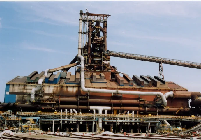 高炉工程では、とっくり型の炉最上部から焼結鉱とコークスを交互に層を造るように装入し、炉下部から熱風を吹き込みます。この熱風でコークスがガス化し、一酸化炭素や水素などの高温ガスが発生し、炉内を吹き昇り、焼結鉱を溶かしながら酸素を奪います。溶けた鉄分はさらにコークスの炭素と接触して還元され、銑鉄となり取り出されます。