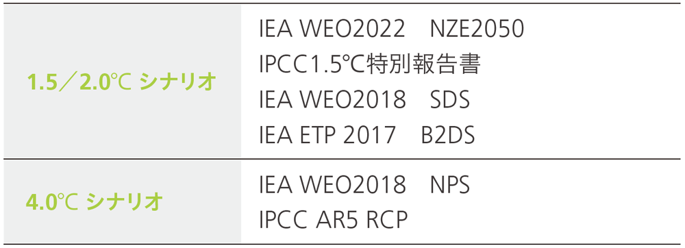 を実施するにあたっては、国際エネルギー機関(IEA)による気候変動シナリオをベースに、移行面では1.5℃シナリオ(NZE2050)や2℃未満シナリオ(B2DS)、物理影響面では4℃シナリオ(NPS)等を参照し、2050年までの中長期の時間軸で評価を行いました。