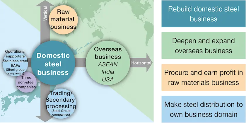 Specifically, we aim to create a more robust business structure by expanding horizontally from the core domestic business and increasing the depth of our business domains vertically. The horizontal axis shows the global expansion of steel production itself, and we are working to expand our integrated steelmaking bases that start with upstream processes overseas such as in the ASEAN countries, India, and the United States. The vertical axes show the expansion in upstream and downstream business domains such as raw materials and distribution/processing. We have already completed investment in a Canadian coking coal business and the consolidation of Nippon Steel Trading, which is engaged in distribution. We will continue such initiatives. By evolving the procurement of raw materials into a "business" and making distribution a part of our own business domains, we aim to build an integrated business structure and strengthen our competitiveness throughout the supply chain. At the same time, we will create a more resilient business structure to achieve carbon neutrality.
