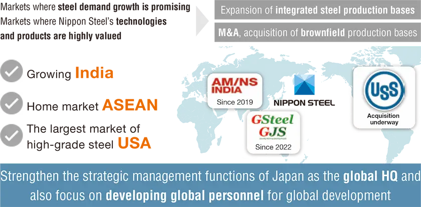 Second, we will further strengthen our global business-our growth engine in terms of both production scale and profit-and enhance the management that supports it. We will expand our integrated steelmaking business in growing markets, particularly in India, ASEAN and North America following the acquisition of U.S. Steel. This means we are entering a new stage in our global expansion. Under these circumstances, our divisions and production bases in Japan will be acting as our global headquarters, deploying the necessary resources according to local needs, and providing strong support for the sound development of our locally based companies. In this way, the domestic steelmaking business needs to become a linchpin that brings together overseas businesses. We will therefore further enhance the strategic headquarters management functions. At the same time, on the technology side in areas such as R&D, manufacturing technology, facility maintenance and engineering, the true value of our manufacturing strength, which has been honed in our domestic business, will be shown on the world stage.