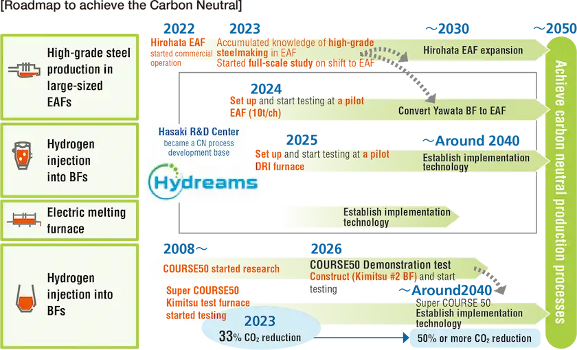 With regard to the progress of technological development and future prospects, technological development has generally been proceeding smoothly, and by the end of 2023, the Kimitsu experimental blast furnace succeeded in reducing CO2 emissions by 33%, which is the world's highest reduction level for a BF-type reaction chamber. As for the large-size EAFs, which can be implemented relatively early, we have built up a track record of high-grade steel production at the Hirohata #1 EAF since 2022, and the construction of an experimental EAF for development will be completed at the Hasaki R&D Center by the end of fiscal 2024. We aim to launch operations by 2030.