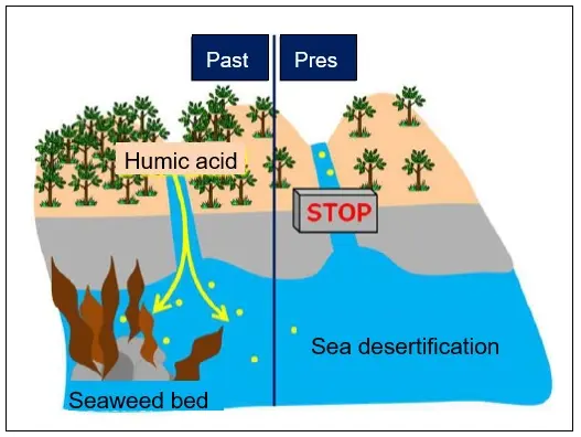 Fig. 1. Supply of nutrients including iron from the land (past) and the resulting rocky-shore denudation (sea desertification) (present)