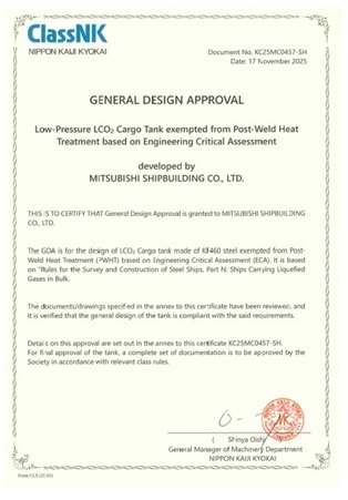 Tokyo, December 5, 2025 – Nippon Steel Corporation (Nippon Steel), and Mitsubishi Shipbuilding Co., Ltd. (Mitsubishi Shipbuilding), a part of Mitsubishi Heavy Industries (MHI) Group have applied Nippon Steel’s developed steel to the cargo tanks of low-pressure liquified CO2(LCO2) carriers and have jointly developed the PWHT*1-exemption technology based on ECA*2. Both companies have recently received the world’s first General Design Approval (GDA)*3 from Nippon Kaiji Kyokai (ClassNK) for this technology.