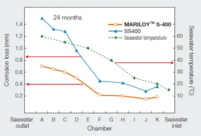 Nippon Steel's MARILOY™ S-400 steel pipe is a steel product containing 1% chromium for enhanced corrosion resistance when used in or on the ocean. The origin of the word MARILOY comes from a combination of MARINE and ALLOY.
