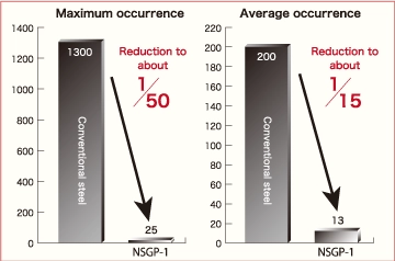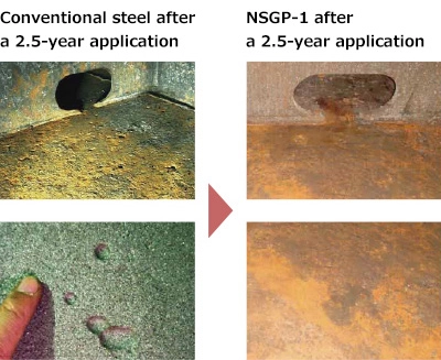 While pitting corrosion to a depth of 4 mm or more occurs at as many as 1,300 locations in tankers using conventional steel over a five-year service period, the adoption of NSGP-1 can suppress the maximum occurrence of such corrosion to about 1/50 that of conventional steel, or 1/15 in average.