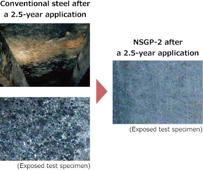Even in a comparison of the number of occurrences of pitting corrosion of 4 mm or more in depth (per tank) after five years of service, tanks using conventional steel registered about 200 instances, while tanks using NSGP-1 registered about 13 instances-reduction to less than 1/15. This proves that NSGP-1 possesses high corrosion resistance.