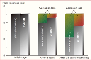 When corrosion loss over a 25-year span is estimated from 10-year application of conventional steel and NSGP-2 in working tankers, it is predicted that, while corrosion loss in conventional steel will surpass the target value of 2 mm, the corrosion loss in NSGP-2 will be held to about 60% that of conventional steel.