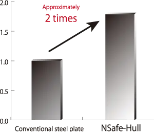 NSafe-Hull is a highly ductile steel plates in which the ductility has been improved by the optimum use of Nippon Steel's original chemical composition design. When an impact force is applied to a ship, it is absorbed by denting of the plates themselves. In the NSafe-Hull, the capacity to absorb collision energy has been improved three times over that of conventional plates. The critical striking ship speed is twice that of conventional plates as well. Consequently the high ductility offered by NSafe-Hull can increase the period in which cracks and ruptures occur in plates.