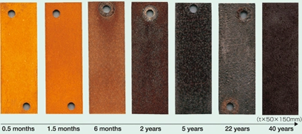 - When COR-TEN with bare specifications is left in the atmosphere, rust occurs first in the same way as ordinary steel, but dense protective rust forms on the surface of the steel due to the action of the alloy element over time, inhibiting the later development of further rust.