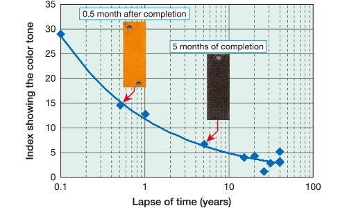 COR-TEN exhibits a yellowish appearance in the initial stage of use, and the color gradually changes to brown. Then, as it sits in its surrounding environment, the color changes to a sedate blackish brown in one to two years. Then, the color changes very little once again, but only to a deep brown.