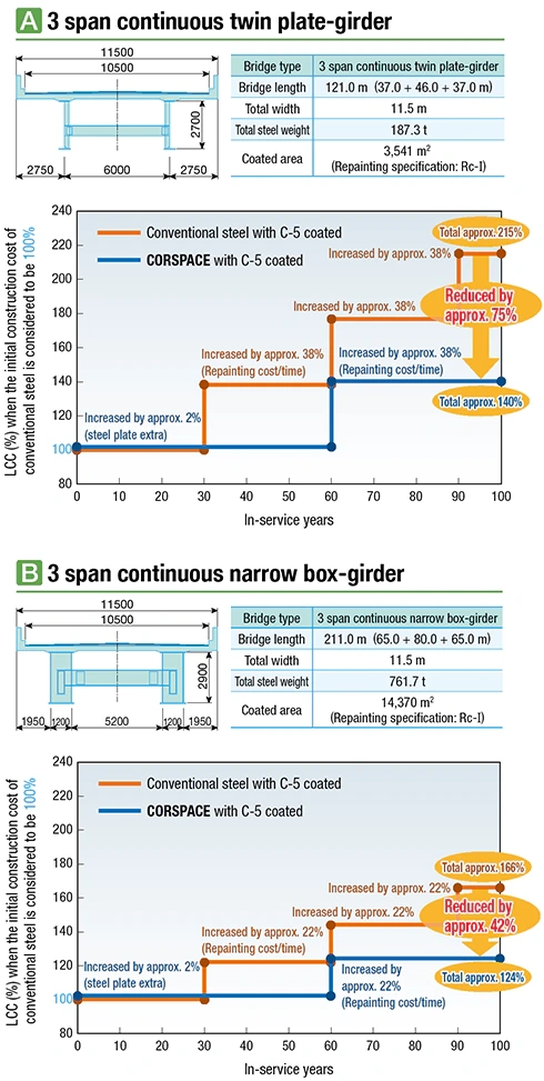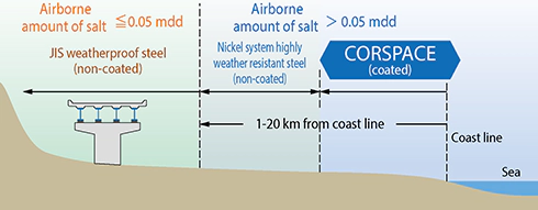 "CORSPACE™" substantially suppresses corrosion by addition of a small amount of tin. Compared to conventional steel, it has a longer span until repainting will be necessary, which will reduce the Life Cycle Cost.