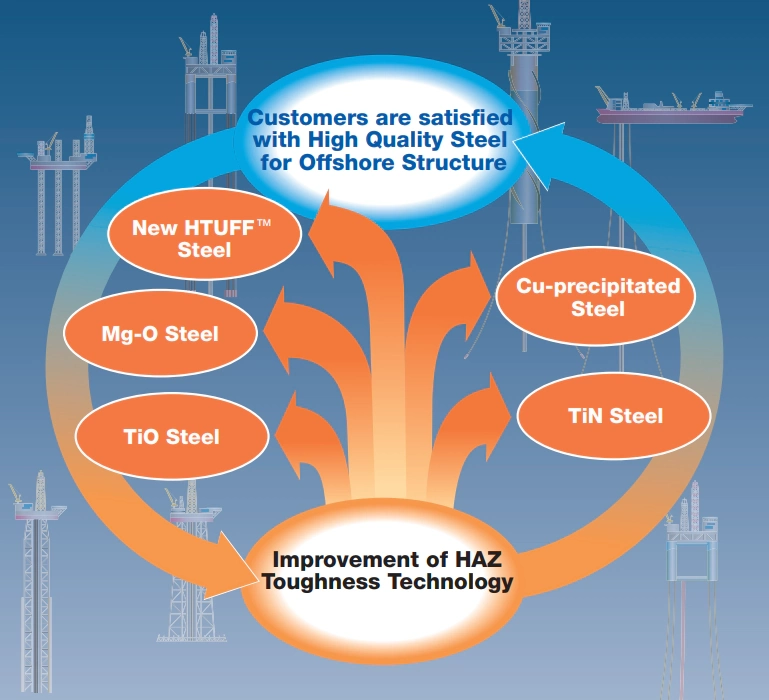 - NIPPON STEEL has applied the TMCP*1 process to offshore structural high tensile steel with excellent weldability and HAZ*2 toughness for the first time in the world.
