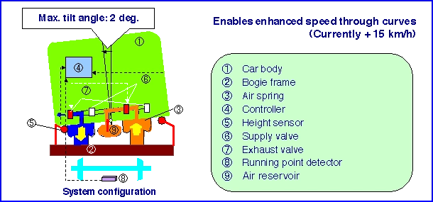 This system can enhance train curving speeds by 10 to 15 km/h, which enables much earlier train arrival times. Air springs installed on the bogies are inflated and deflated to tilt the car body, in the same way that a motorcycle rider inclines his or her body when cornering, allowing the vehicle to take curves smoothly. This system gives the bogies a far more simple construction than pendulum-type car bodies, also resulting in easier maintenance.