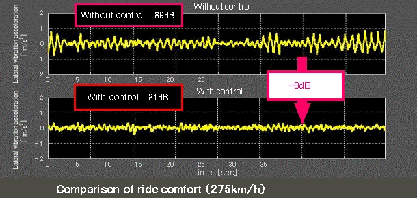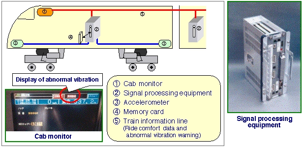 This system has the function of providing data that can be used to help locate the source of any abnormal car vibration and to manage ride comfort. For instance, it constantly looks out for any occurrence of "hunting," which directly affects running safety, At the same time, it also capable of recording all data related to car vibration and ride comfort to assist in car inspection and maintenance. This can be accomplished by a simple mechanism consisting of accelerometers and signal processing equipment.