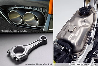In the field of two- and four-wheeled vehicles, is where improvements in various performances such as lightness, high strength, and high-corrosion-resistance are required. NIPPON STEEL Corporation NIPPON STEEL offers titanium alloy products superior not only in performance but also in machinability and workability at room temperature, which perform their full abilities in exhaust system parts and engine parts. We have also worked on applying these materials to new parts and firstly succeeded in adopting them to fuel tank bodies for mass-production two-wheeled vehicles. We are planning to develop the world's best comprehensive abilities in steel making so as to provide customers with values by proposing them solutions in cooperation with processing vendors with the intention to contribute to the reduction of the weight of vehicle bodies.