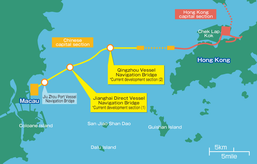 Hong Kong-Zhuhai-Macau Link Road A large project of road with a length of about 36km (China side: about 30km, Hong Kong side: about 6km) linking Hong Kong and Macau. The bridge part is 21.8km long and the cable stayed bridge part is 1.5km long. |