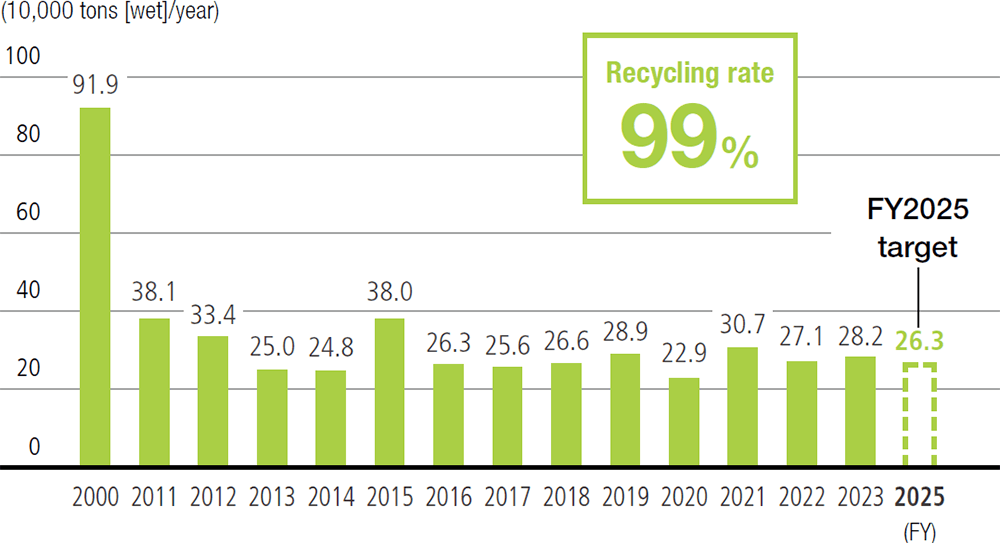 We are committed to recycling these by-products both in and outside the Company, maintaining the high recycling rate of 99%. For the final disposal amount, we will continue efforts to reduce generation of by-products toward achieving the fiscal 2025 target.