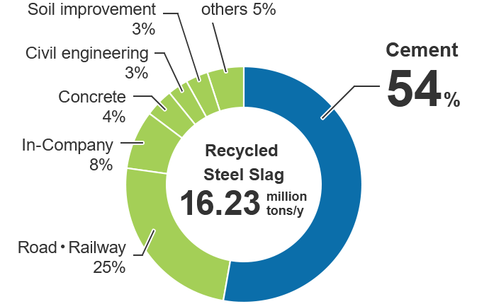 Almost all steel slag is effectively utilized. Approximately 70% of blast furnace slag is used for blast furnace cement, while steelmaking slag is used for materials for road base layers, civil engineering work, soil improvement, marine environment improvement, fertilizer, etc.