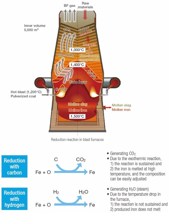 In this process, coal (coke) is 1) a reducing agent, 2) a source of heat, and 3) plays a role to support the function of raw materials at high temperature in a solid form while facilitating to maintain ventilation in the furnace. Although the coal (coke) has been utilized in a continuous, efficient steelmaking from iron ore, CO2 is inevitably generated during the reduction reaction.