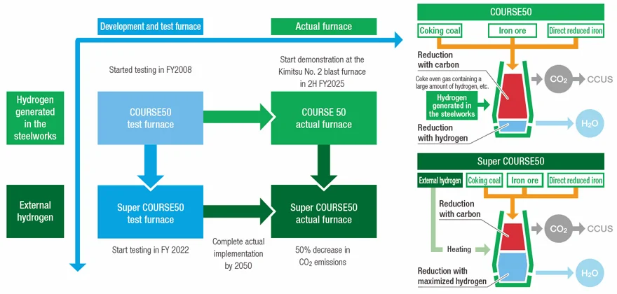 The COURSE50 is a technology development project that was undertaken from 2008 to 2022 with the aim of partially realizing steel production using hydrogen in the current situation where there is no infrastructure for supplying large amounts of hydrogen.