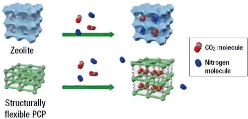 To separate/capture CO2 efficiently from low-pressure, low concentration emission gases (with a CO2 concentration of 10% or less at the atmospheric pressure), we are working on the development and social implementation of a new CO2 separating agent (structurally flexible PCP), which has higher CO2 selectivity and enables CO2 adsorption and desorption with minimal levels of pressure operation.