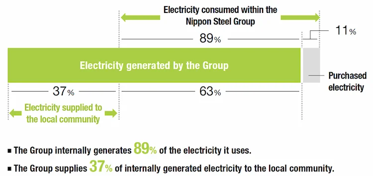 In addition, Nippon Steel itself generates 91% of the electricity it uses at steelworks, 72% of which is from internally generated energy sources such as waste heat and by-product gases. By not wasting but utilizing energy generated within the steelworks, we do our part to reduce CO2 emissions.