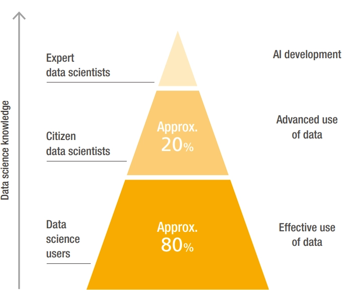 We are developing human resources in both data science and digital management. As for data science education, our goal is to develop DX skills training to enable all office staff to become data science users “who can effectively use data” by 2030, and to grow at least 20% of our office staff and engineers into citizen data scientists “who can make advanced use of data.”
