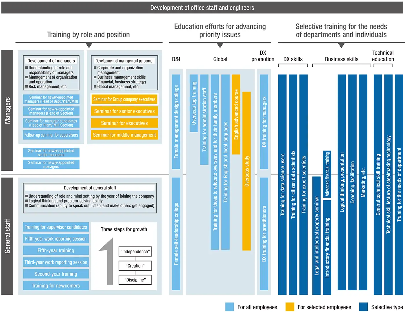 Off-the-job training (OFF-JT), which complements OJT, is used throughout the Company by organizing the minimum skills and knowledge required by each rank of employees of the Nippon Steel Group into a company-wide standard system. Through this, we work at education of workplace leaders to further increase their ability to add to and improve our knowledge base from the field (“field technology”) and at measures to maintain and improve motivation of older people to continue working with health and motivation.