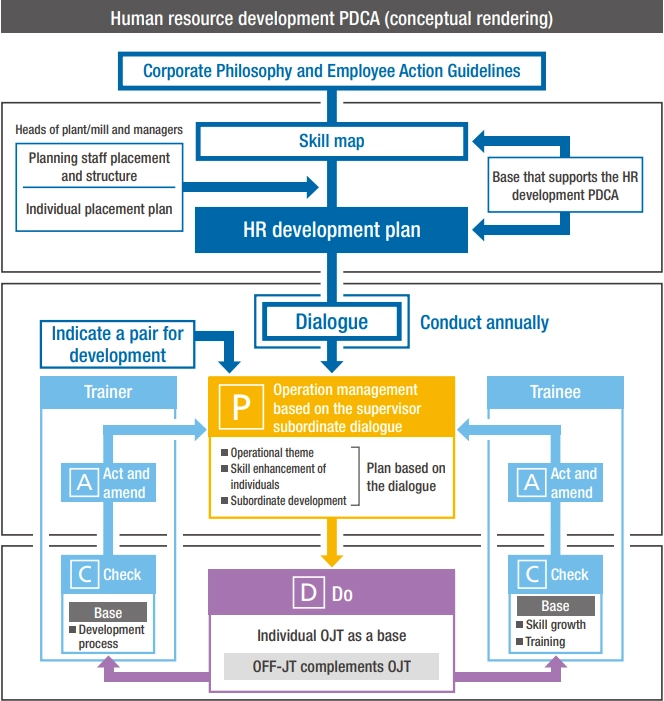 The operators and maintenance staff continuously build up their skills in steelmaking and maintenance, starting when joining the Company, on the assumption of continued long-term employment to retirement. Smooth transmission of technology and skills from veterans to younger workers is essential and a system that facilitates this is needed. Therefore, after identifying, through a supervisor-subordinate dialogue, the skill or skills to be acquired, a skill development plan is developed and carried out. Training is conducted mainly through On-the-Job Training (OJT), and the HR Development PDCA is kept up to date for use by repeatedly revising and implementing the development plan based on the progress of individuals.
