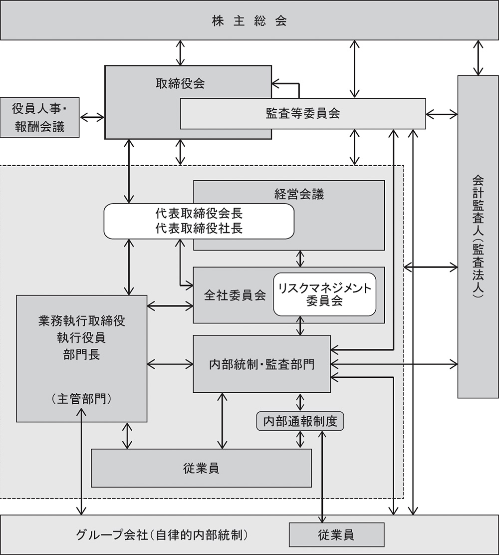 経営の健全性の確保にあたっては、当社事業に精通した社内出身の常勤の監査等委員である取締役と、高い識見を有する監査等委員である社外取締役により構成される監査等委員会が、内部統制システムの整備・運用状況、業務基盤の整備状況、経営計画諸施策の推進状況等を重点監査項目として、内部監査部門と連携し、計画的に日々の監査活動を進める体制としている。また、すべての取締役がそれぞれの役割・責務を適切に果たすことで、取締役会における多角的な検討と意思決定の客観性・透明性を確保している。