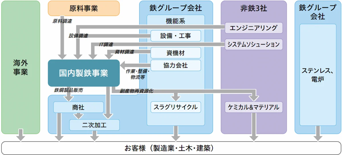 当社グループの事業領域は、 鉄鋼業のバリューチェーンの川上から川下にわたっており、 一貫製鉄事業を営む当社と、バリューチェーンの各工程を担うグループ会社との間で重要な戦略を共有し、グループ企業価値の最大化を目指しています。