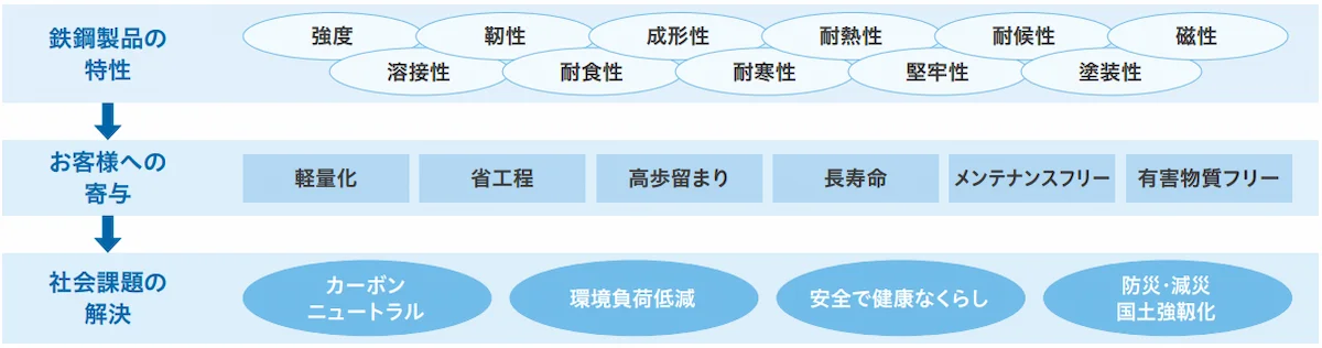 高級鋼は、 鉄を加工するお客様の価値創造に寄与します。例えば軽量化、 加工工程の省略、 素材の歩留まり向上、 製品の長寿命化、メンテナンス・有害物質フリー等です。このような効果によって、 カーボンニュートラルや環境負荷低減、 安全で健康な暮らしや国土強靱化等、 社会課題の解決に貢献するインパクトを生み出しています。