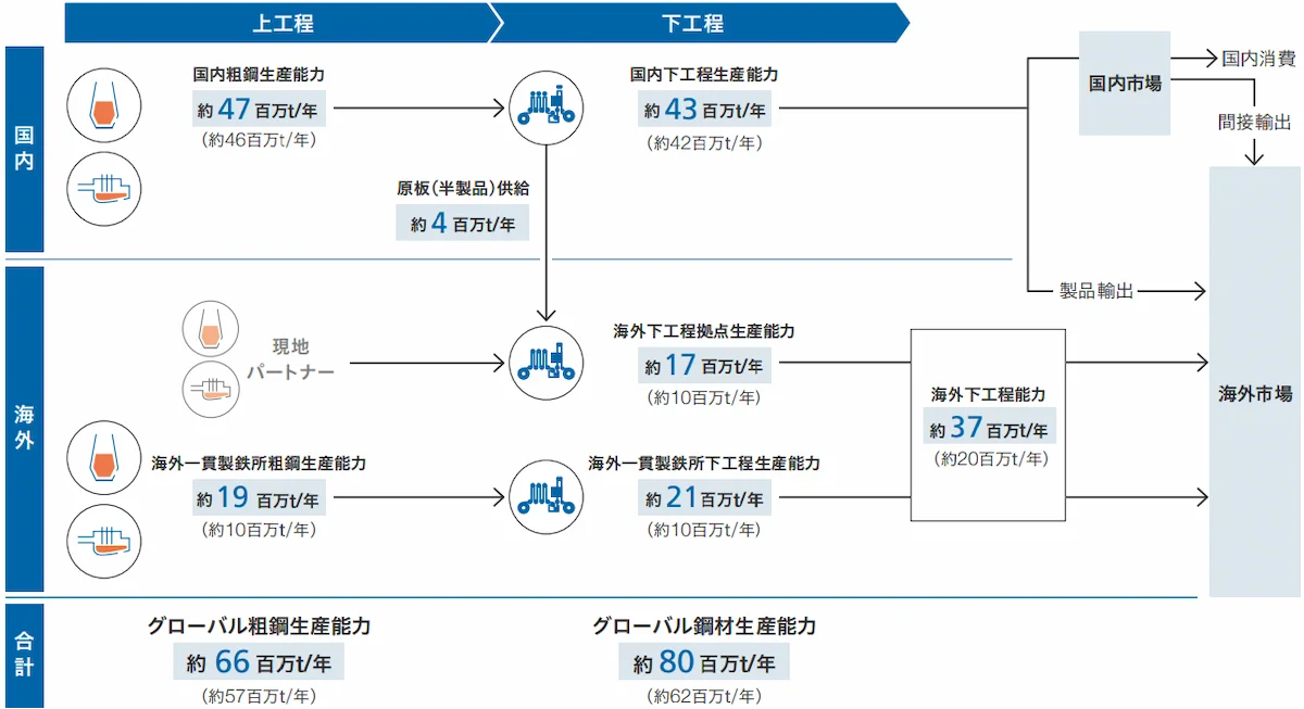 現在、グループ全体の海外製造拠点の生産能力は、 粗鋼生産能力約1,900万トン/年、 鋼材生産能力約3,700万トン/年の規模があります。