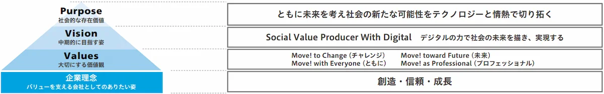 - 信頼:私たちは、法と社会のルールを守り、常に社会・顧客の視点で物事を考え、社会・顧客から信頼を得ることを目指します。