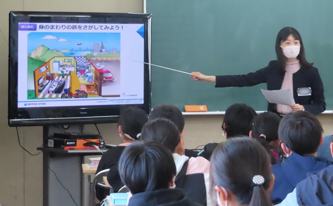 当該出張授業では、日本製鉄新潟支店のスタッフが、「私たちの身近な鉄の世界」と題して、様々なインフラに使われている鉄、鉄づくりの学習の他、LCA(ライフサイクルアセスメント)動画を使って鉄が環境にやさしい素材であることを伝えました。