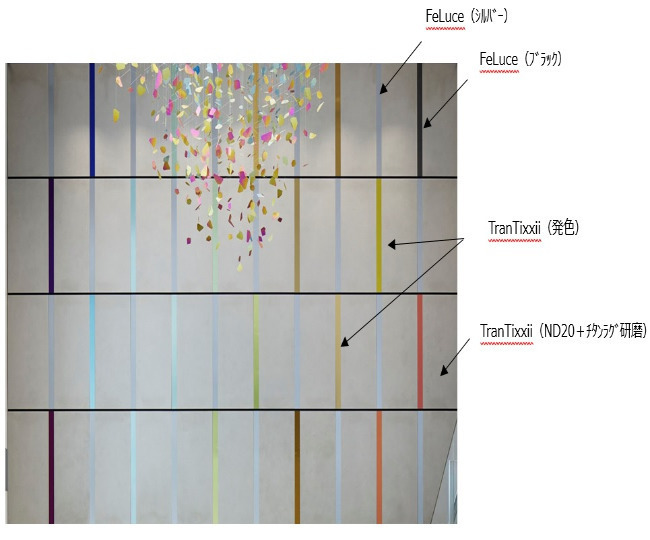今回の壁面では、光の角度や見る位置によって色調が変化するTranTixxii®
