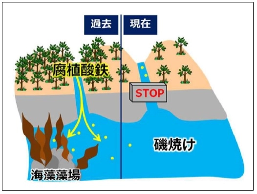 海藻藻場は多様な生態系を支える重要な場ですが、明治時代より海藻藻場は減少(磯焼け)し始め、現在も全国で進行しています。なお、磯焼けの原因として、海藻の捕食動物の増加、栄養塩の減少、鉄不足等が推定されています。② 従来技術の課題
