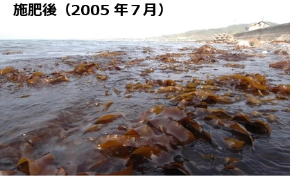 2004年から北海道増毛町で鉄系施肥材による海藻藻場の造成を開始し、2014年には同町別苅で45tを施工し、2022年までに3.6haの再生と1.8倍のウニ漁獲高の向上を実証(図3)しました。また、当該取り組み事例を参考に、2023年時点で全国56箇所に展開しており、造成した海藻藻場では、海藻などにより貯留されるCO2量、ブルーカーボン量を評価し、2022、2023年度に計82.8t-CO2のジャパンブルーエコノミー技術研究組合認証のJブルークレジットを取得しています。