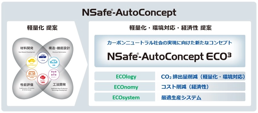 今回の展示会で、日本製鉄は、“NSafe®-AutoConcept(略称NSAC® 以下、NSAC)”の軽量化技術をさらに深化させ、「LCAでのCO2排出量削減」、「コスト削減」、「最適生産システム」の視点で、最適な自動車ソリューションを提案するコンセプト“NSafe®-AutoConcept ECO3(エコキュービック)(以下、NSAC ECO3)”により、お客様とともにカーボンニュートラル社会の実現を目指します。