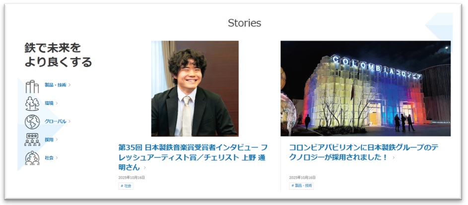 「Stories」:https://www.nipponsteel.com/newsroom/stories/