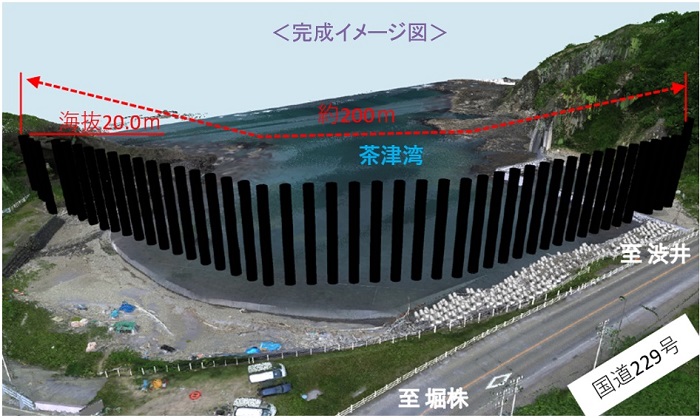 現在、泊発電所の安全対策工事として、津波の引き波による国道229号線上の車両流出を防ぎ、漂流物が発電所に悪影響を及ぼさないよう、茶津湾に鋼管杭を設置する工事が進められています。鋼管杭は、鉄の高い靭性と衝突耐力に加え、コスト・工期の両面で本工事に最適な素材として採用に至りました。鋼管杭の打設は2026年3月に開始予定です。