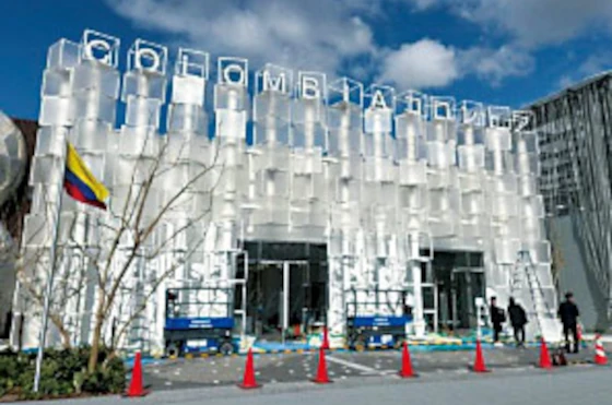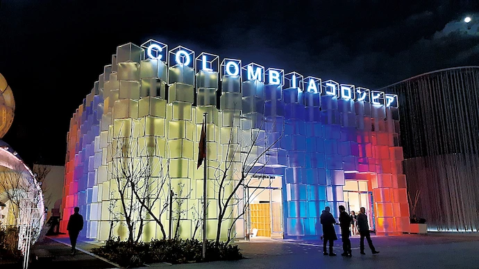 コロンビアパビリオンはさまざまな角度の多数の半透明キューブで構成されたファサードデザインが特徴的だ。ICE CUBE と呼ばれる半透明キューブは、ポリカーボネート板でつくられ、色彩をコントロールできるライトアップによって、いろいろな美しい表情を見せる。日中から夜間まで来訪者の目を楽しませてくれる。