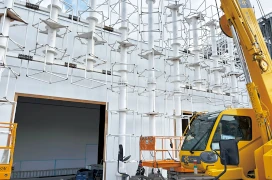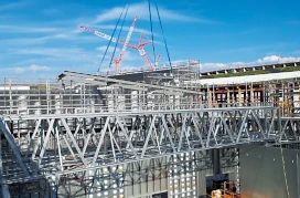 「基礎工事を9月中に終えたあと、10月12~13日の2日間で72枚の壁パネルを組み立て、14~23日の10日間で32ユニットの屋根トラスを地上で連結して載せました。わずか12日間で躯体工事を完了したわけですが、一夜城のようにでき上がった躯体を目の当たりにした他の工事関係者は驚いていました。結局、他のパビリオンの工事は間に合わず、重機を用いた工事期間は延長されていました」(守沖さん)