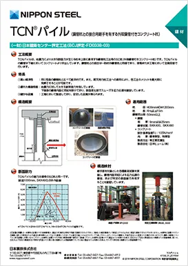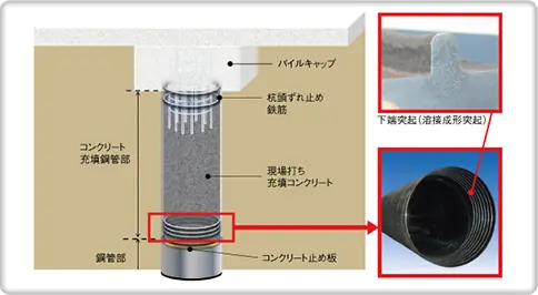 TCN®パイルは、地震力により大きな断面力が生じる杭体上部に適用する鋼管杭工法用のSC杭(外殻鋼管付きコンクリート杭)です。TCN®パイルの鋼管は下端においてコンクリートより突出しています。鋼管杭との接合は一般的な鋼管杭と同様であり、現場または工場において全周溶接で行います。