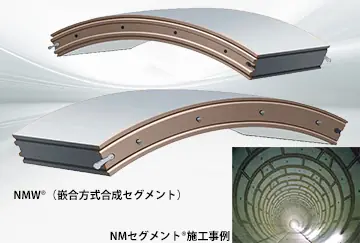 トンネル覆工からの漏水、覆工コンクリートの剥離・崩落リスクを可能な限り抑制し、トンネル耐久性の改善を目指した嵌合(かんごう)方式合成セグメント-NMセグメント-を1996年より提供してきました。NMセグメントは、その止水性能、耐力性能、組立容易性などにおいて皆さまから高い評価をいただき、これまでに数多くの大口径地下河川トンネル、鉄道、道路トンネルに採用されてきました。