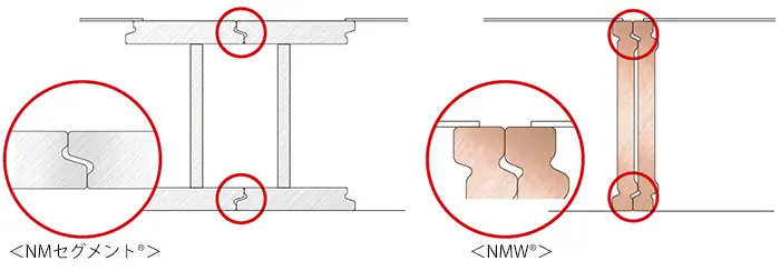 NMセグメントの最大の特徴であるリング間嵌合構造と同様の構造を、NMWでも採用しております。これにより、高い止水性能、現場組立容易性といったNMセグメントの機能をNMWでも再現しました。