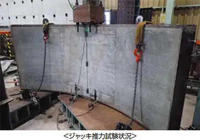 ジャッキ推力作用状況を模した載荷試験を実施し、ジャッキ推力作用時においても有害なひび割れや変形が生じないことを確認しております。載荷荷重は、コンクリート短期許容応力度に相当する荷重×1.1倍まで載荷しております。