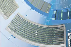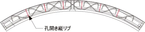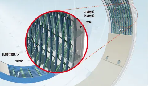 『孔開き縦リブ』縦リブに孔開き加工を施し、中詰コンクリート中に埋設された主要引張構造部材である鉄筋を貫通させることで、鋼殻と中詰コンクリートの一体化を実現します。さらに縦リブで仕切られたダイヤフラム構造を形成することで中詰コンクリートのせん断耐力を強化し、最小限のせん断補強筋のみで多量の主鉄筋の採用を可能としています。